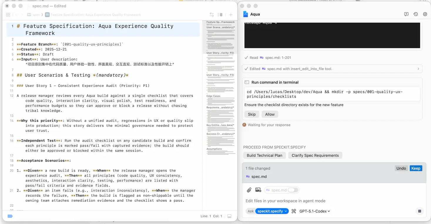 仔细想想,为什么 spec-kit 要设计这么多步骤呢?只执行一个命令,通过问答来一步到位生成所有文档不好吗?我理解是强制用户在每一步完成之后停下来,检查 AI 的输出,审阅并修改,之后或是重新执行当前过程,或是继续下一步。每一步都一定要是针对当前项目来实施的,例如在 agent 里面运行 /speckit.constitution 时,不要照抄示例 /speckit.constitution Create principles focused on code quality, testing standards, user experience consistency, and performance requirements,而是要考虑当前项目真正的原则,给后续的文档实施定一个跟当前项目有关的大基调。