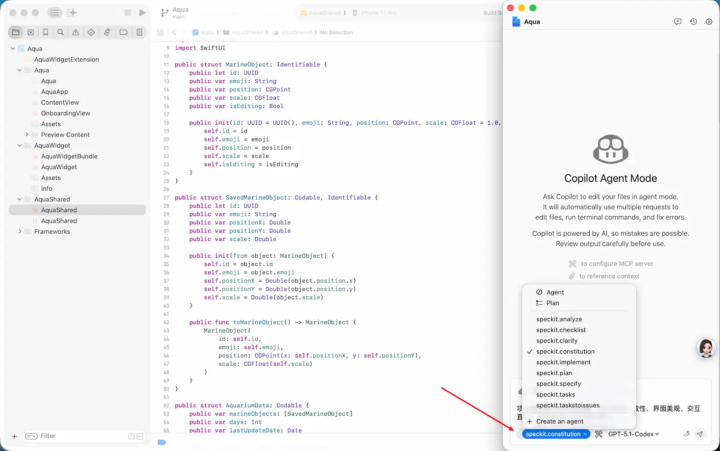进入到 agent 界面,安装好 spec-kit 之后,CopilotForXcode 中便会出现 spec-kit 工具的命令。这个项目我选择的是 GPT-5.1 Codex,是 open ai 最新推出的针对编码调优的模型。