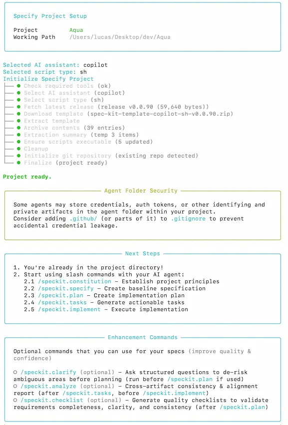 由于我已经有一个 demo 了,在 demo 目录下运行 specify init . --ai copilot,注意,这是在终端里面运行,而不是在 agent 对话里面运行的。在简单几个问答之后,有如下输出
